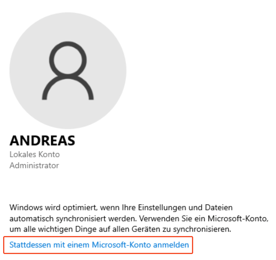 Falls nein, dann das lokale Adminkonto in ein Microsoft-Konto umwandeln: